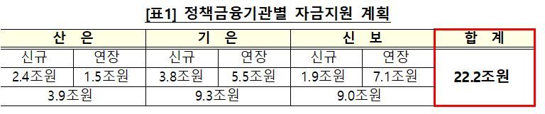 신용보증기금은 보증 형식으로 총 9조원(신규 1조9000억원, 연장 7조1000억원)을 공급한다. 현재 운용 중인 특례보증, 우대보증 프로그램 등에 대해 심사절차를 간소화하고 보증료, 보증비율, 보증한도 등을 우대한다.