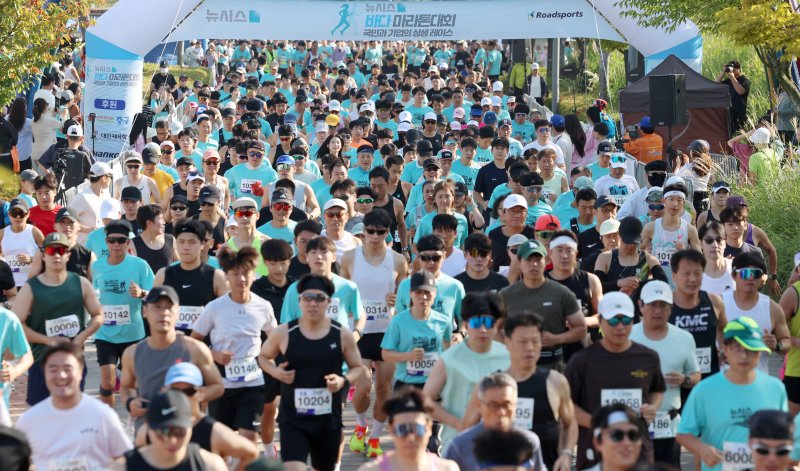[인천=뉴시스] 조성우 기자 = 27일 인천 중구 씨사이드파크 하늘구름광장에서 열린 제1회 뉴시스 바다마라톤 대회에서 참가자들이 힘차게 달리고 있다. 2025.09.27. xconfind@newsis.com [인천=뉴시스]안경남 박윤서 하근수 김희준 신유림 기자 = 영종도의 푸른 하늘과 탁 트인 해변을 달린 '제1회 뉴시스 바다 마라톤 대회'가 27일 인천광역시 영종도 하늘구름광장에서 성황리에 폐막했다.