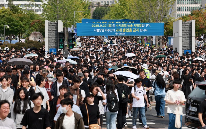 [서울=뉴시스] 이영환 기자 = 수험생들이 27일 서울 서대문구 연세대학교에서 열린 수시모집 논술 시험을 마친 후 학교 밖으로 나서고 있다. 2025.09.27. 20hwan@newsis.com [서울=뉴시스] 이영환 기자 = 27일 서울 서대문구 연세대학교에서 2026학년도 수시모집 논술전형 논술 고사가 진행됐다.