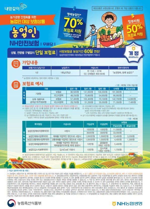 농작업 중 발생한 사고에 대한 입원비·수술비·간병비뿐만 아니라 특정 질병 진단 수술·상해·질병 치료비까지 폭넓게 보장한다. 농업작업안전재해 사망보험금 연장 적용 특약도 있어 보험기간이 끝난 뒤 60일 이내 사망 시 유족급여와 장례비 등도 보장받을 수 있다.