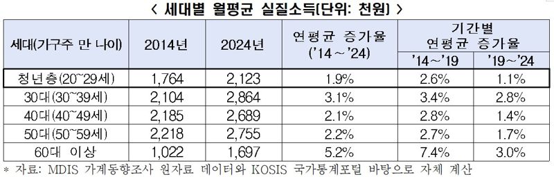 조사 결과 지난 2014년부터 10년간 청년층 실질소득 증가율은 연 1.9%로 전 세대 중 가장 낮았고, 실질소득 증가 추세도 과거 5년(2014~2019년) 연평균 증가율 2.6%에서 최근 5년(2019~2024년) 연평균 1.1%로 둔화된 것으로 집계됐다.