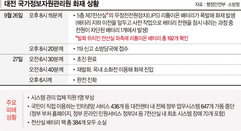 정부가 선제적 조치에 나설 수도 있다. 현재까지 국정자원 화재의 원인은 리튬이온 배터리 교체 작업 중 발생한 불꽃 또는 폭발로 추정된다. 배터리 권장 사용연한을 1년 넘겼고, 배터리를 옮기는 과정에서 작업자의 실수 가능성도 거론된다. 어느 쪽이라도 국가 정보기술(IT) 관리와 감독에 허점이 드러나는 셈이 된다.