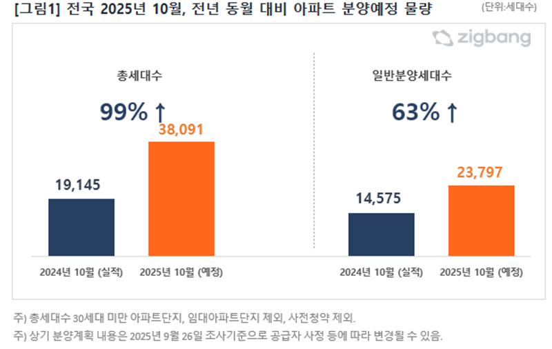 29일 직방에 따르면 오는 10월 전국 아파트 공급 예정 물량은 총 3만8091가구로 지난해 같은 달 1만9145가구와 비교해 99% 늘었다. 일반공급도 2만3797가구로 집계돼 지난해 10월 1만4575가구 보다 63% 증가할 전망이다.
