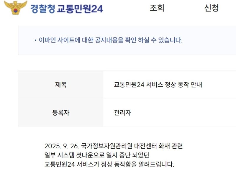 [파이낸셜뉴스] 대전 국가정보자원관리원(국정자원) 화재 여파로 중단됐던 교통범칙금·과태료 납부 시스템이 복구됐다.