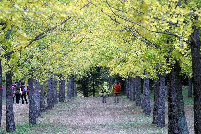 29일 홍천군에 따르면 홍천 은행나무숲은 4만㎡ 부지에 은행나무 2000여 그루가 식재돼 있으며 2010년 개방한 이후 매년 10만명 이상 관광객이 찾는 가을 대표 명소다.