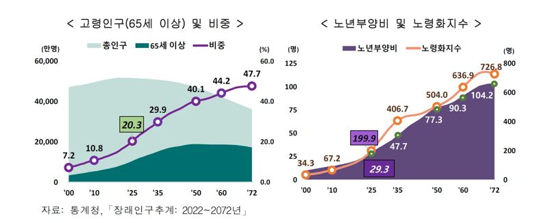 후세대 부담은 커졌다. 생산연령인구(15~64세)에 대한 고령인구(65세 이상) 비중을 나타내는 노년부양비는 올해 29.3명, 2035년 47.7명, 2050년 77.3명에 이를 것으로 전망되기 때문이다. 생산연령인구 100명이 올해 30명 가까운 노인을 부양하는 상황에서 10년 뒤 50명 가까운 노인까지 급증하는 것이다. 불과 5년 전인 2020년 21.8명, 2010년 14.8명, 2000년 10.1명에 비해 급속도로 늘어났다.