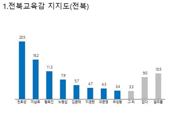 이번 조사에서 '다음 인물 중 차기 전북교육감으로 누가 가장 적합하다고 생각하십니까'라는 질문에 응답자의 23.5%가 천호성 전 자문위원을 지지한다고 답했다. 이남호 전 전북대 총장을 선택한 응답자는 16.2%였다. 1위와 2위의 격차는 7.3%로 오차범위(±3.1p) 밖이다.