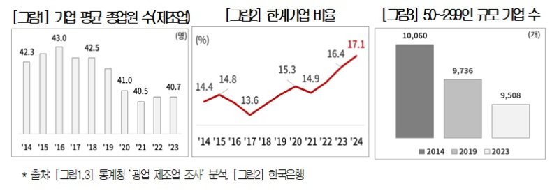 기업당 평균 종업원 수는 2016년 43명에서 2023년 40명대 수준으로 내려앉으며 영세화 흐름을 드러냈다. 공장 자동화 등 영향도 있을 수 있으나 본질적으로는 중소기업의 대기업으로 성장이 활발히 이뤄지지 못한 채 소규모 기업만 계속 늘어나고 있는 결과라는 분석이다.