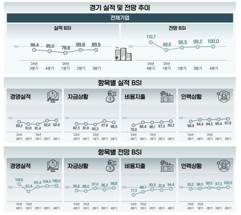BSI(Business Survey Index)는 기업의 현재 상황 판단과 미래 전망을 조사한 경기 예측 지표다. 100 미만이면 악화, 100이면 보합, 100 초과면 호전으로 해석한다.