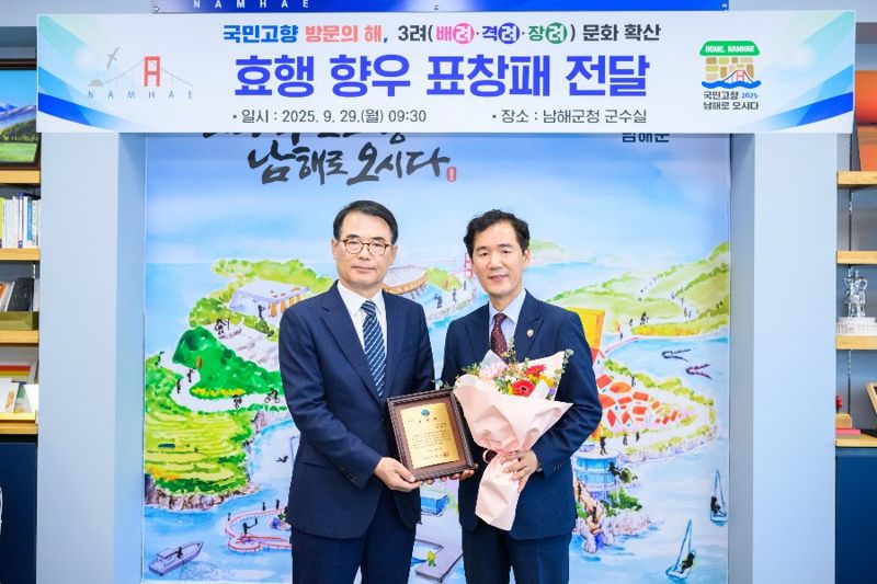 남해군은 최 회장이 고향에 계신 부모님을 지극 정성으로 보살피고 지역사회 귀감이 되는 효를 몸소 실천했다며 '2025년 고향사랑 방문의 해'를 맞아 남해군민의 따뜻한 마음을 담았다는 내용을 패에 새겨 전달했다.
