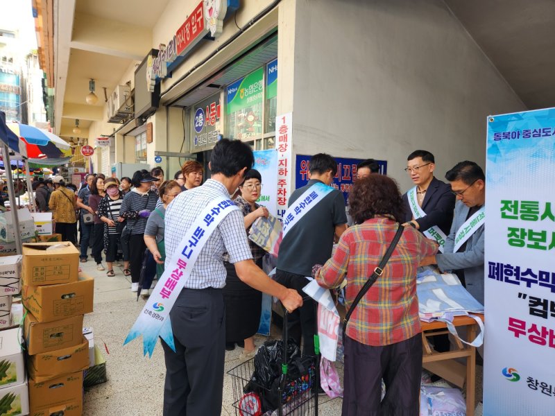 버려지는 현수막을 재활용해 장바구니로 제작·보급하면서 자원순환을 실천하고 시민들의 친환경 소비 문화를 확산하기 위해 마련됐다. 행사에는 상남시장상인회, 경남옥외광고협회 창원시지부, 시청 건축경관과 직원들이 참여했다.