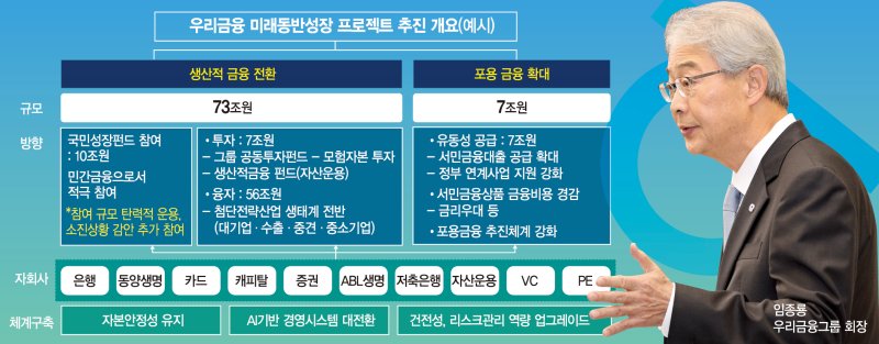 임종룡 우리금융지주 회장은 29일 "국민성장펀드의 150조원 중 75조원은 한국산업은행이 조성하고, 나머지 75조원은 민간에서 조성한다"면서 "우리금융은 75조원 가운데 10조원의 재원을 마련해 참여하겠다"고 말했다. 임 회장은 이날 서울 중구 우리은행 본점에서 이같은 내용을 담은 '우리금융 미래동반성장 프로젝트'를 직접 발표했다. 미래동반성장 프로젝트에는 오는 2030년까지 총 5년간 80조원이 투입된다. 생산적 금융에 73조원, 포용금융 확대에 7조원이 들어간다.