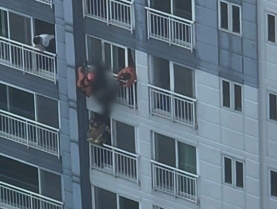 [파이낸셜뉴스] 고층 아파트 난간에 거꾸로 매달려 있던 젊은 여성이 119 구조대원들에게 극적으로 구조됐다.