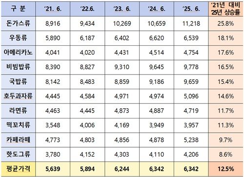 품목별로는 돈가스류가 8916원에서 1만1218원으로 25.1% 상승해 가장 급격한 인상률을 기록했다.