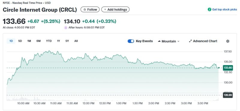 29일(현지 시각) 뉴욕증시에서 서클은 5.25% 급등한 133.66달러를 기록했다.