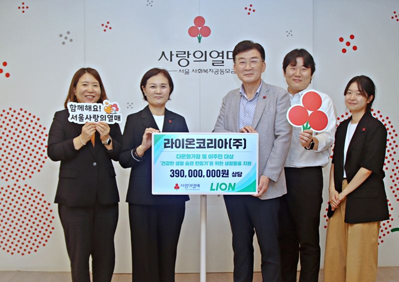 기부 물품 전달식은 지난 17일 서울 중구 사랑의열매에서 김도형 라이온코리아 경영지원담당 상무, 신혜영 서울 사랑의열매 사무처장 등 관계자가 참석한 가운데 진행됐다. 기부품은 세이브더칠드런과 서울시가족센터를 통해 청결∙위생 관리가 필요한 다문화가정과 이주민에게 배부될 예정이다.