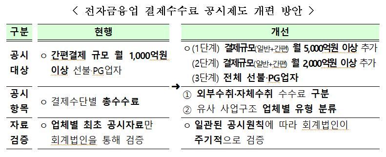 금융위는 이 같은 개편방안을 반영해 ‘전자금융업자 결제수수료 공시 가이드라인’을 개정하고, 오는 11월 수시공시를 시행할 계획이다.