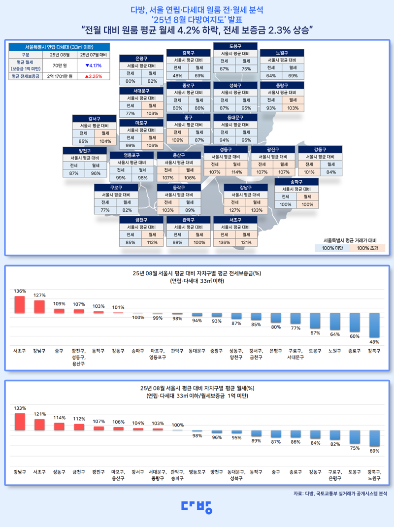 30일 다방이 공개한 다방여지도에 따르면 올해 8월 기준 서울 지역 전용면적 33㎡ 이하 연립∙다세대 원룸의 보증금 1000만원 기준 평균 월세는 70만원, 평균 전세 보증금은 2억1701만원을 기록했다. 이는 직전 달인 7월보다 월세는 3만원(4.2%) 줄고, 전세 보증금은 478만원(2.3%) 오른 수치다.