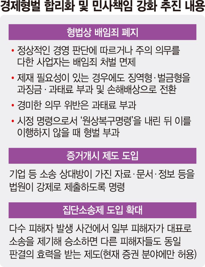 당정은 이날 배임죄를 포함한 110개 경제형벌 규정도 함께 개선한다고 밝혔다. 형사처벌 중심의 경제형벌은 처벌 수위는 낮추는 대신 징벌적 손해배상 책임을 도입하는 등 제도를 개선하기로 했다. 경미한 규정 위반에 형사처벌이 남발되는 것은 과도하다는 지적에 따른 것이다.