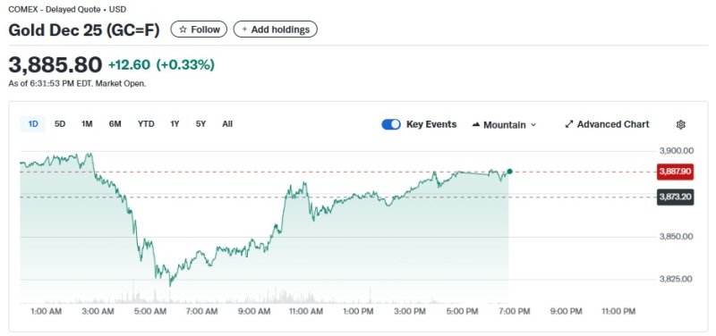 이에 비해 금값은 사상 최고치를 경신했다. 같은 시각 코멕스(COMEX)에서 금 선물은 0.33% 상승한 온스당 3885.80달러를 기록하고 있다.