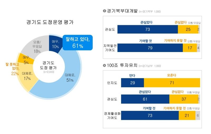 북부지역 거주 도민 1000명을 대상으로 실시한 여론조사 결과, '경기북부대개발' 사업에 대해 73%가 관심을 보였고, 79%는 북부지역 발전에 기여할 것이라고 답했다.