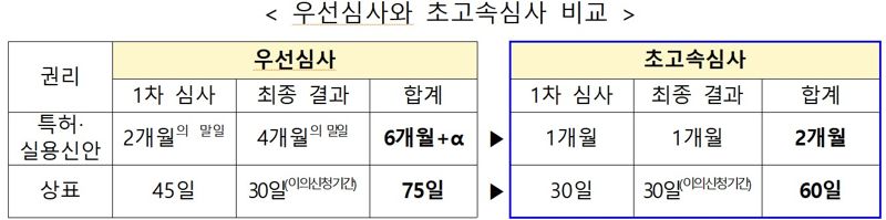초고속심사는 특허·실용신안 출원에 대해서는 1개월 이내, 상표 출원은 30일 이내에 1차 심사결과를 제공하는 제도로, 기존 우선심사와 대비해 심사기간이 대폭 단축된 제도다.