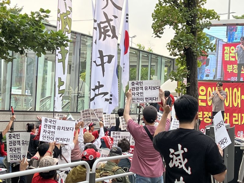 하루 전 여의도 국회의사당역 3번 출구 인근에서 열린 '중국인 무비자 입국 반대 집회'에서는 100여 명이 모여 '반중멸공' 구호를 외치며 무비자 입국 정책에 반대 목소리를 높였다.
