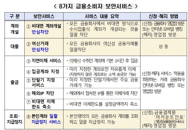 금감원 관계자는 “금융사에 따라 보안서비스 내용 및 신청·해지 절차에 차이가 있을 수 있고 해지를 위해 영업점 방문을 해야 할 수 있다”며 “본인 금융사기 위험정도, 비대면거래 수요 등을 고려해 서비스 신청 여부를 결정하면 된다”고 말했다.