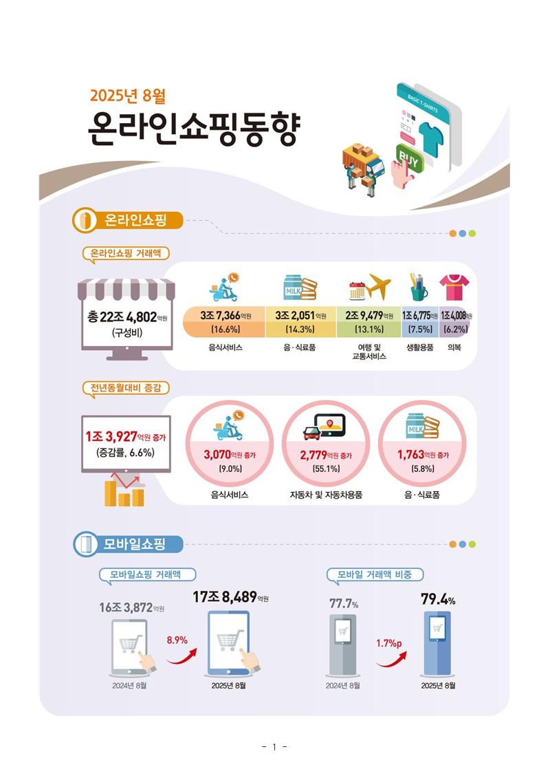 1일 통계청 ‘8월 온라인 쇼핑동향’에 따르면 온라인 쇼핑거래액은 22조4802억원으로 전년동월 대비 6.6%(1조 3927억원) 증가했다. 음식서비스는 3조7366억원으로 전년동월 대비 3070억원(9.0%) 증가했다.