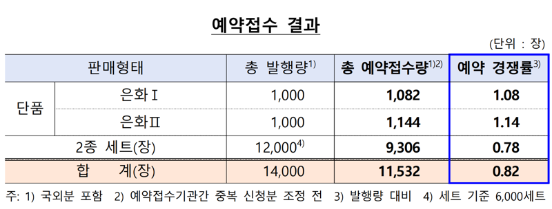 한은에 따르면 이번 기념주화 발행량 1만4000중, 구매예약 물량은 1만1532장인 것으로 나타났다. 판매 형태별로 보면 단품 경쟁률은 은화Ⅰ 1.08대1, 은화Ⅱ 1.14대1 이며 2종 세트는 0.78대1을 기록했다.