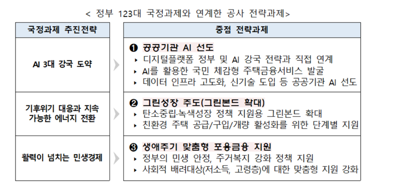 주금공은 국정과제와 연계한 전략과제로 △공공기관 AI 선도 △그린성장 주도 △생애주기 맞춤형 포용금융 지원을 선정했다. 이를 수행하기 위해 AI를 활용한 국민 체감형 주택금융서비스를 발굴하고 친환경 주택공급 활성화를 지원하면서 정부의 민생안정과 주거복지 강화 정책 지원 등에 적극 나설 계획이다.