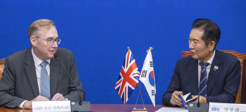 정 대표는 크룩스 대사를 만나 "한반도에 대한 깊은 이해와 애정을 바탕으로 지금껏 한국과 영국 관계를 굳건히 다져준 데 대해 깊이 감사드린다"며 "한국과 영국은 자유와 인권, 민주주의라는 보편적 가치를 공유하며 오랫동안 협력해온 동반자"라며 환담을 건넸다.