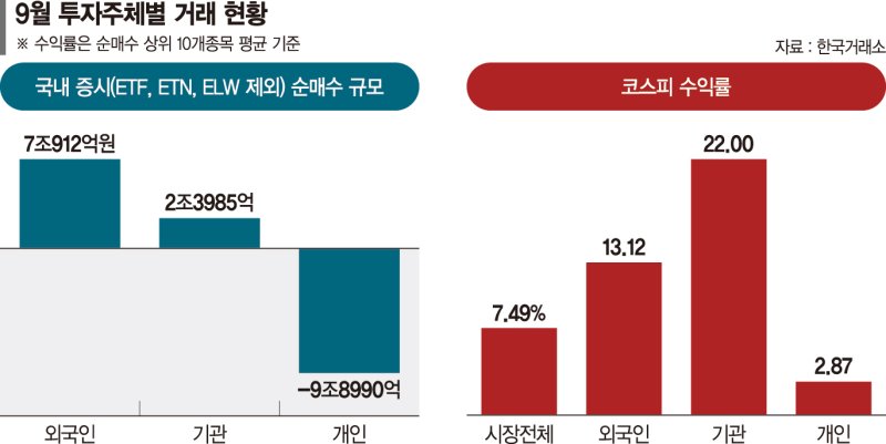 개인은 외국인과 기관의 매수로 높아진 가격 부담에 순매도 행렬을 이어갔다. 개인은 지난달 9조원가량을 팔아치웠으며, 순매도 상위 10개 종목 중 9개가 외국인과 기관이 많이 사들인 상위 10개 종목과 겹쳤다. 반도체 관련주는 △삼성전자 7조2620억원 △SK하이닉스 1조7306억원 △삼성전자우 6189억원 △삼성전기 3719억원 등을 순매도했다.