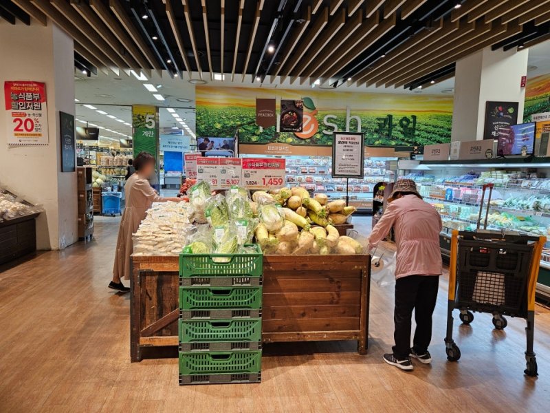 1일 오전 서울 중구 이마트 청계천점. 이른 아침이지만 추석을 앞두고 장을 보러 나온 소비자들로 매장이 붐볐다. 입구 신선식품 코너에서는 가격 할인 안내 방송이 연이어 흘러나왔다. '농식품부 할인지원'이 적힌 팻말 앞에서 국거리용 무를 고르던 주부 김모씨(58)는 "농식품부 할인이 체감될 정도로 싸게 느껴지진 않는다"며 "물가가 오르는 게 너무 당연해져서 생활비가 항상 빠듯하다"고 하소연했다.