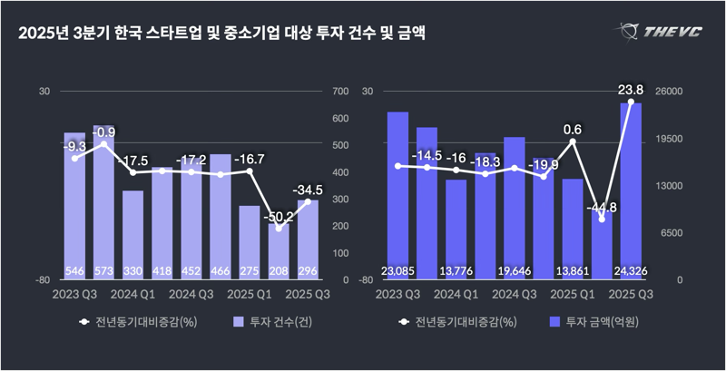 2일 스타트업 자본시장 데이터베이스(DB) 기업 더브이씨가 공개한 '2025년 3·4분기 국내 스타트업 및 중소기업 투자 통계'에 따르면 3·4분기 투자 건수는 296건으로 전년 동기 대비 35% 줄었다. 다만 투자 금액은 2조4326억원으로 직전 분기 대비 152%, 전년 동기 대비 24% 증가했다. 분기 투자금액이 2조원을 넘은 것은 2023년 4·4분기 이후 처음이다.