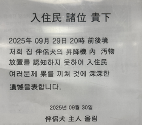 견주가 쓴 사과문에는 "입주민 제위(여러분) 귀하. 2025년 9월 29일 20시 전후경 저희 집 반려견의 승강기 내 오물 방치를 인지하지 못하여 입주민 여러분께 누를 끼쳐 것에 심심한 유감을 표합니다. 2025년 9월 30일 반려견 주인 올림"이라는 내용의 글이 한자와 섞여 적혀 있다.