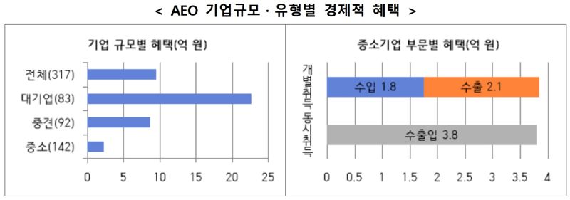 분석 결과, 수출입 부문 AEO 317곳이 지난 한 해 동안 받은 혜택의 경제적 효과는 최소 2992억 원으로, 1개 사 평균 9억4000만 원의 경제적 혜택을 누렸다.