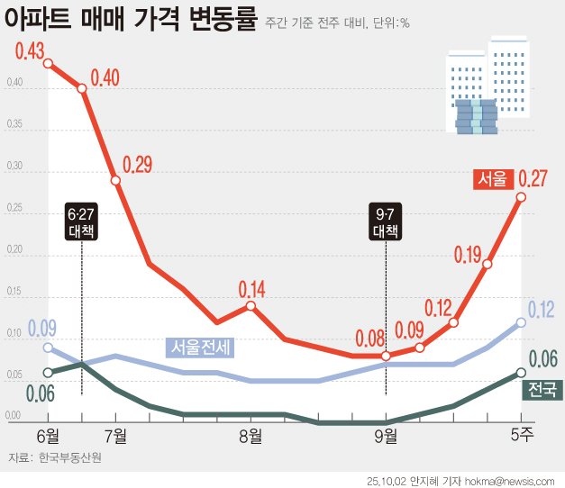 서울 아파트 매매가격(0.19%→0.27%)은 9·7 공급대책 발표 이후 4주 연속 상승폭이 커지며 전국의 집값 상승을 이끌었다. 9월1일 0.08%→9월8일 0.09%→9월15일 0.12%→9월22일 0.19%→9월29일 0.27%로 상승속도가 점차 빨라지는 추세다.