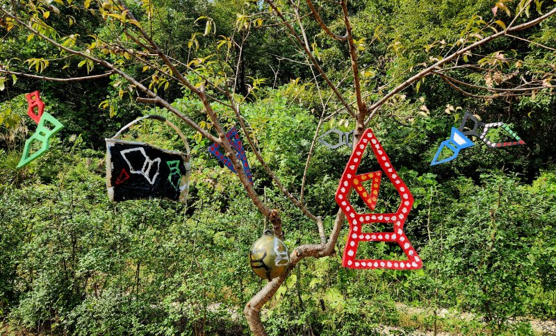 (포항=뉴스1) 최창호 기자 = '독도 서예가'로 불리는 쌍산 김동욱 씨가 2일 경북 포항시 북구 기계면 인비리 암각화공원에서 암각화를 형상화한 작품을 전시했다.
