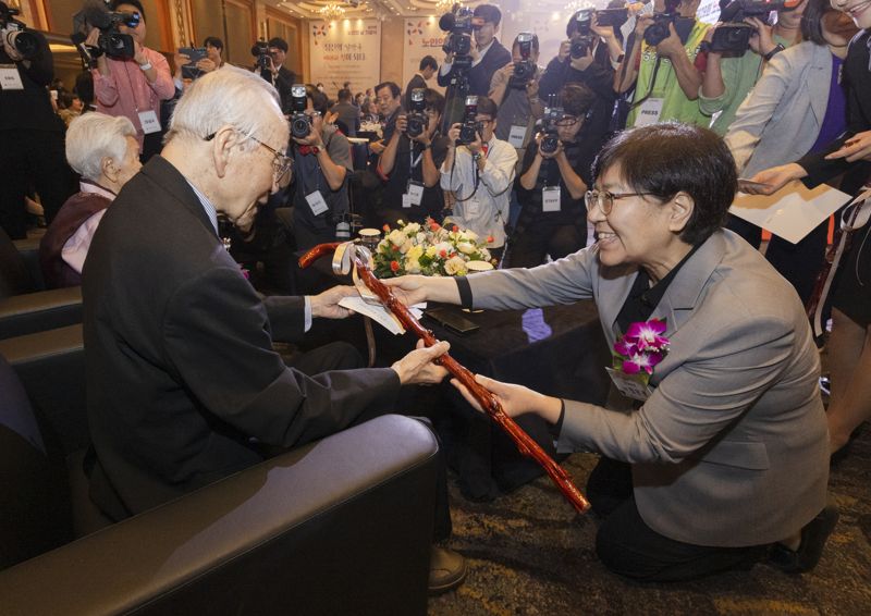 [파이낸셜뉴스] 정은경 보건복지부 장관은 2일 서울 중구 소공로 롯데호텔 크리스탈볼룸에서 열린 제29회 노인의 날 기념식에 참석해 이재명 대통령의 축사를 대독했다. 이 대통령은 축사에서 "정부는 어르신들이 행복하고 건강한 노후를 보내실 수 있도록 든든한 울타리가 돼드리겠다"고 말했다. 이날 기념식에는 정 장관과 이중근 대한노인회장 등 노인단체 관계자, 훈·포장 수상자와 가족 등 400여명이 참석했다. 정 장관이 기념식에서 올해 100세를 맞은 장수 어르신 2568명을 대표해 참석한 어르신에게 청려장을 전달하고 있다. 청려장은 명아주라는 풀로 만든 가볍고 단단한 지팡이다.