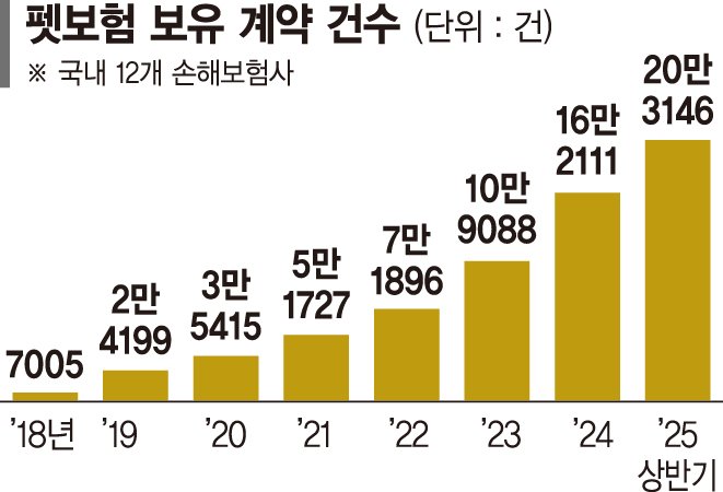 국내 최초로 장기 펫보험이 출시된 지난 2018년 이후 펫보험 수요는 꾸준히 상승하고 있다. 지난 2018년 7005건이던 보유 계약 건수는 5년이 지난 2023년 10만9000여건으로 10배 이상 뛰었고, 지난해에는 16만2000여건을 기록했다. 올해 상반기 기준 보유 계약 건수는 20만3146건으로 집계돼 연말 기준 사상 최고치에 이를 전망이다.