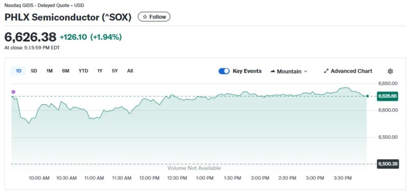 2일(현지 시각) 뉴욕증시에서 반도체지수는 1.94% 급등한 6626.38포인트를 기록했다.