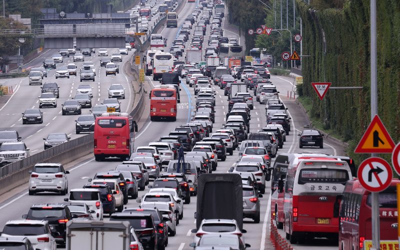 (서울=뉴스1) 신윤하 기자 = 추석 황금연휴 첫날이자 개천절인 3일 오후 귀성 차량으로 인한 정체가 계속되고 있다. 다만 오전보다는 차량 흐름이 원활해진 상태다.