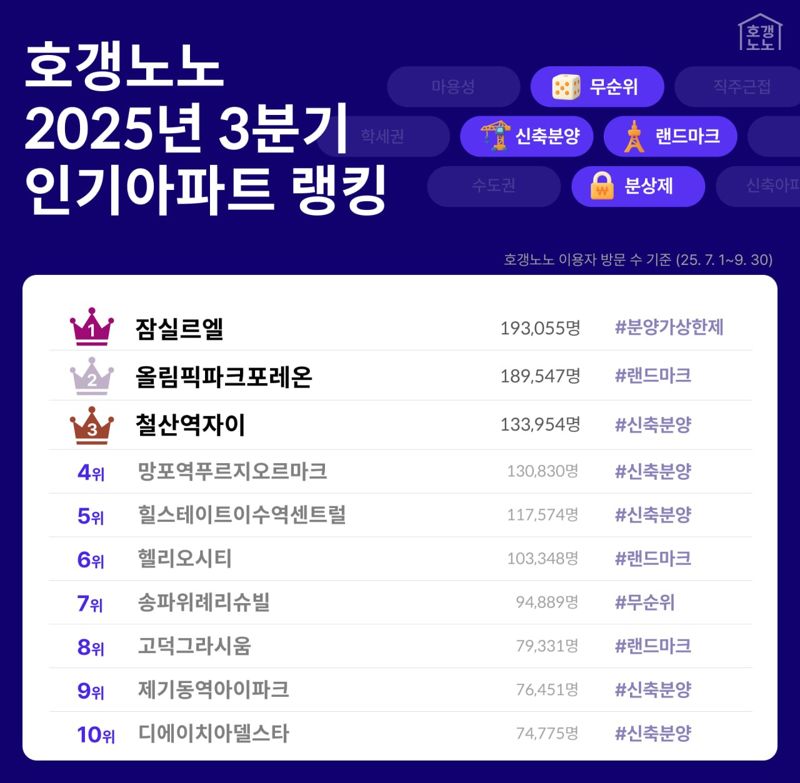 신규 공급단지 강세 속 지역별 랜드마크 단지 순위권 유지