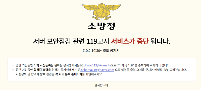 소방청은 유출을 인지한 직후인 2일 오후 10시30분을 기준으로 사이트를 폐쇄하고, 합격증 출력 등 채용 관련 업무는 이메일 등 대체 절차를 통해 처리하고 있다.