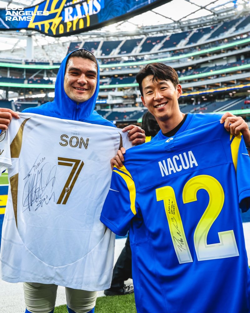 =소파이 스타디움에서 손흥민은 램스의 와이드리시버 푸카 나쿠아와 반갑게 인사를 나누고 사인 유니폼을 교환했다. 특히 램스 구단으로부터 'SON'과 등번호 7번이 새겨진 유니폼을 선물 받은 손흥민은 유니폼을 입고 트레이드 마크인 '찰칵' 세리머니를 선보여 현지 팬들의 환호를 받았다. 이 장면은 NFL 공식 계정에서도 소개되며 그의 인기를 실감케 했다.