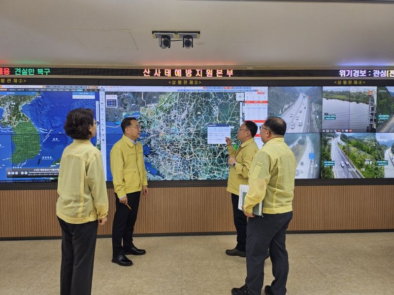 [파이낸셜뉴스] 김인호 산림청장(왼쪽 두번째)이 5일 정부대전청사 산림청 중앙산림재난상황실을 찾아 산림재난 대비 태세를 점검하고 있다.