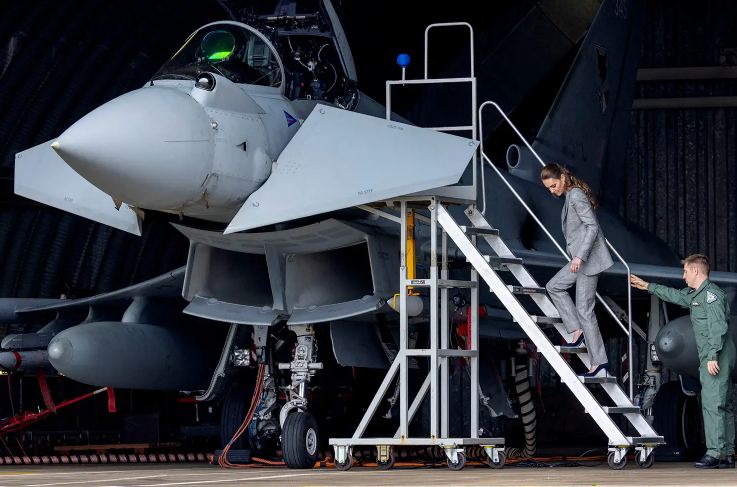 4일(현지시간) 뉴욕포스트, 피플 등 외신은 케이트 왕세자빈이 최근 영국 공군 코닝즈비 기지(RAF Coningsby)를 방문해 전투기를 둘러보던 중 기체 외부에 설치된 이동식 계단을 내려오는 장면이 카메라에 포착됐다. 회색 정장차림에 높은 하이힐을 신은 탓에 높은 계단을 내려오는 게 쉽지 않다고 판단한 듯 케이트는 시선을 전투기로 향한 채 뒤로 걸어 내려왔다.