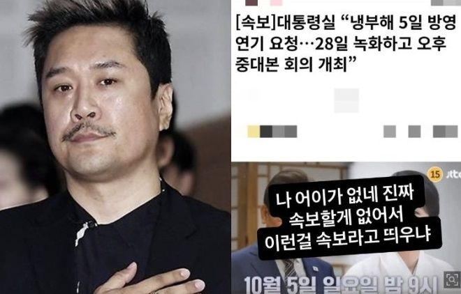 그가 공유한 기사에는 ‘대통령실이 5일 방영 예정이던 ’냉장고를 부탁해‘ 특집의 방영 연기를 요청했으며, 지난달 28일 녹화 후 같은 날 오후 중대본 회의를 열었다’는 내용이 담겼다.