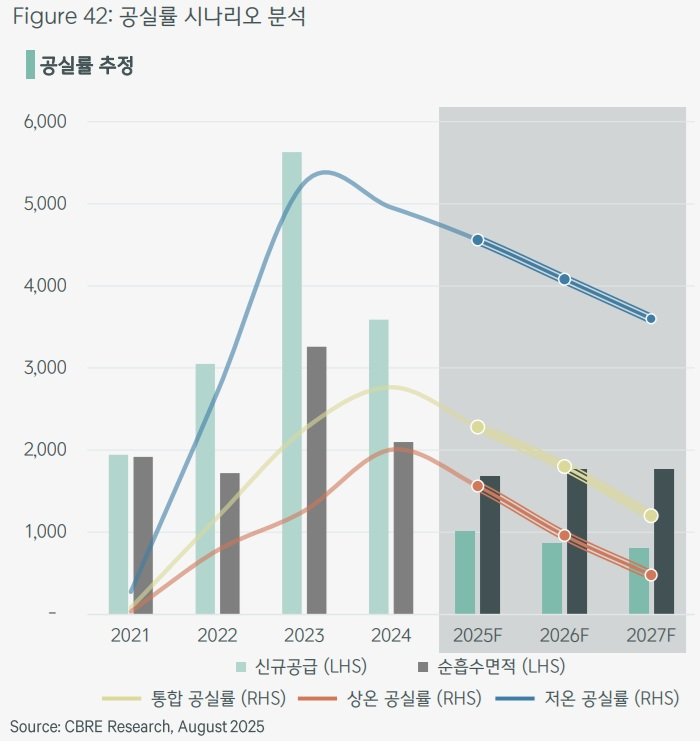 상온 물류센터는 약 4% 이하로 떨어질 것으로 예상되지만, 저온 물류센터는 과잉 공급과 수요 회복 지연으로 최소 30% 이상 공실률이 지속될 가능성이 있다.